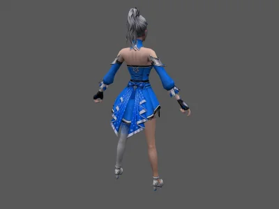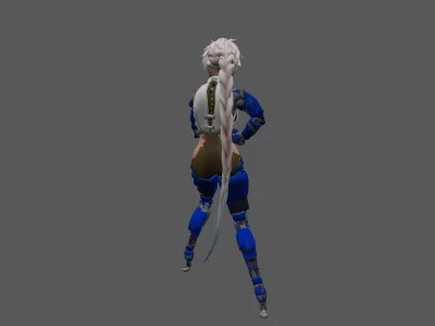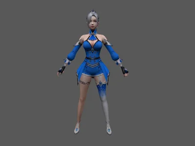 Модель «Skadi»: стройная ледяная ассасинка с сине-белой бронёй, сияющими голубыми глазами, длинными волосами, морозными клинками и ледяными аксессуарами, создаёт грациозный, смертоносный и зимний