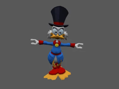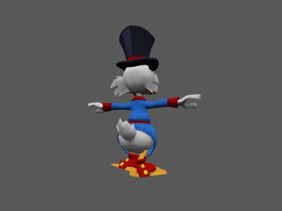 Модель Скруджа МакДака: антропоморфная утка в красном сюртуке, цилиндре и пенсне, жёлтый клюв, уверенный взгляд, золотые детали, мультяшный стиль и ощущение богатства.