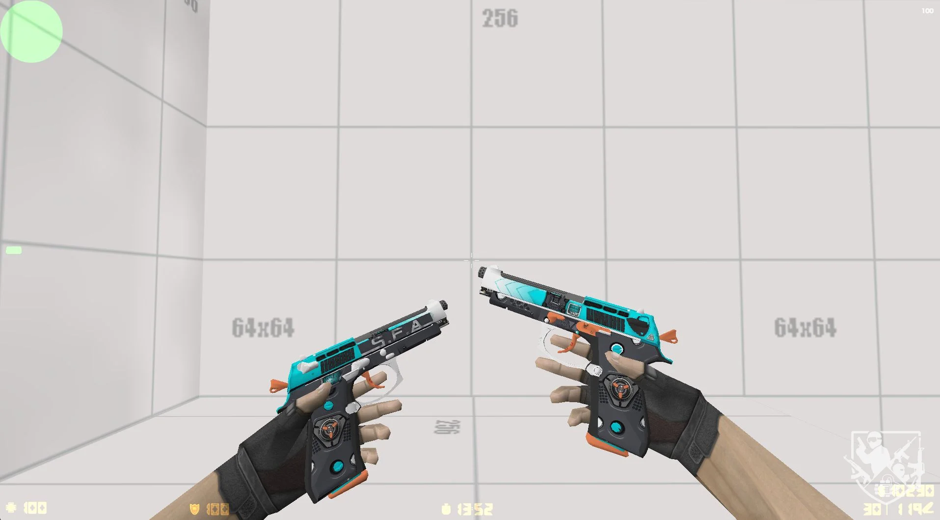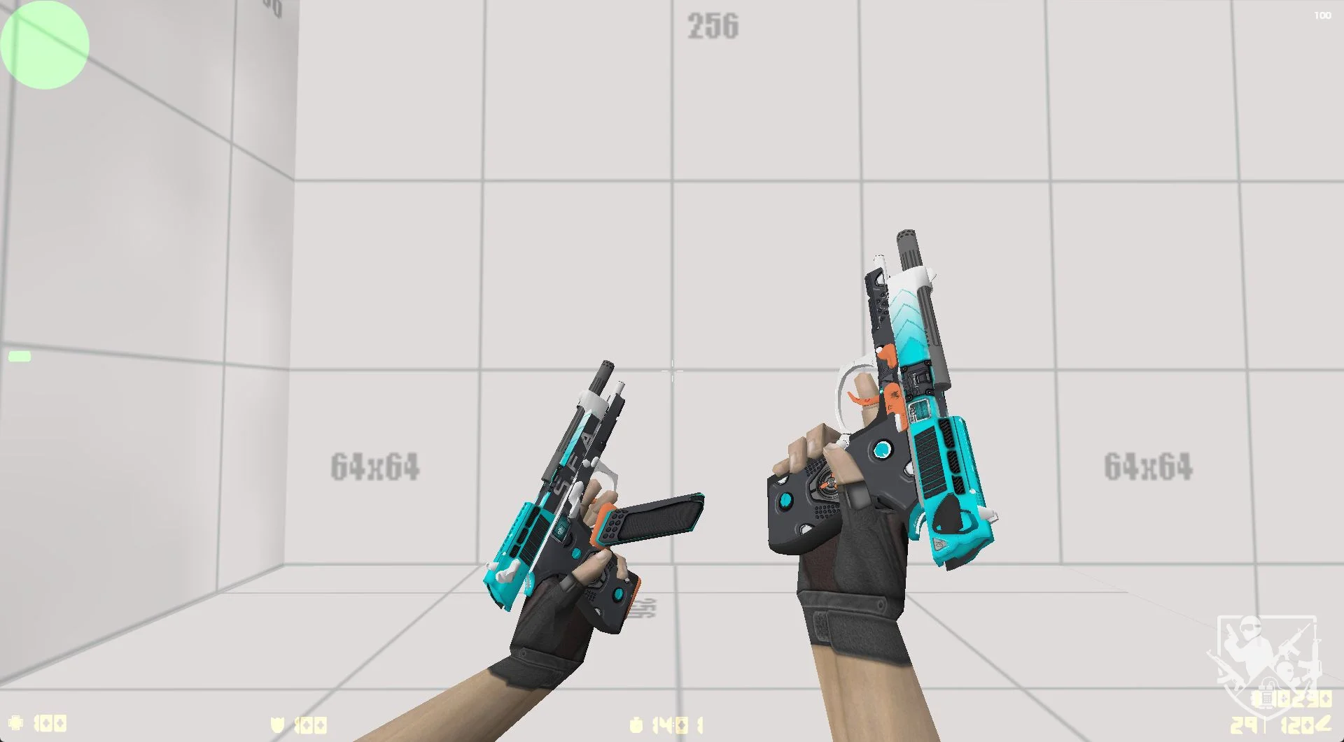 Модель Dual Elites «Dual Pulse» - футуристический дизайн этих Dual Berettas сочетает холодный бирюзовый корпус, белые технологичные элементы и яркие оранжевые акценты. Чистые линии и механические детали придают оружию вид экспериментального прототипа, созданного для высокоточных операций.