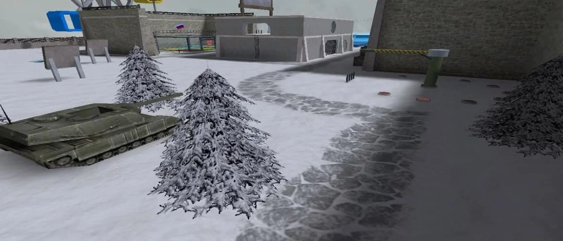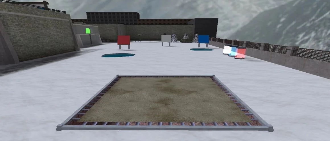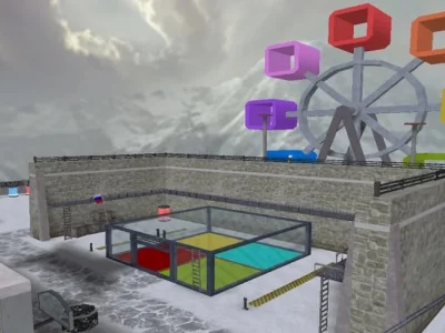 Этот игровой уровень представляет собой уникальное сочетание заброшенного, но функционального объекта, расположенного в суровой горной местности, покрытой снегом. Атмосфера холодного, уединенного места только усиливает ощущение опасности и изоляции. Основная часть карты представляет собой архитектурный комплекс, напоминающий собой некую оборонительную структуру или промышленное сооружение, адаптированное под нужды игрового процесса. Грубые каменные стены, сложенные из массивных блоков, задают общий тон сурового реализма. По всей территории разбросаны элементы, служащие как для укрытия, так и для создания стратегических точек. В одном из ключевых секторов карты располагается открытая арена, ограниченная невысокими каменными стенами. На этой арене находится центральный элемент – стеклянный куб, разделенный на четыре цветовые зоны: красную, желтую, зеленую и голубую. Этот элемент, вероятно, служит ключевой точкой для выполнения заданий или ареной для схваток. Неподалеку от него установлена конструкция, напоминающая колесо обозрения, но с квадратными капсулами вместо привычных кабинок, что добавляет карте уникальный, несколько сюрреалистичный колорит.