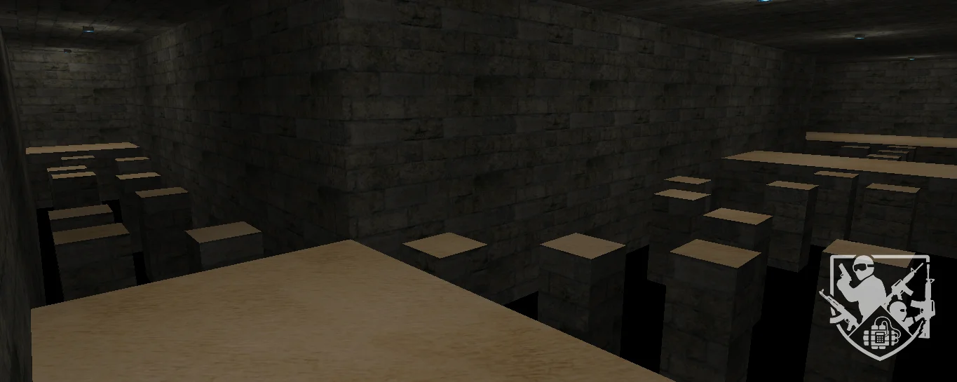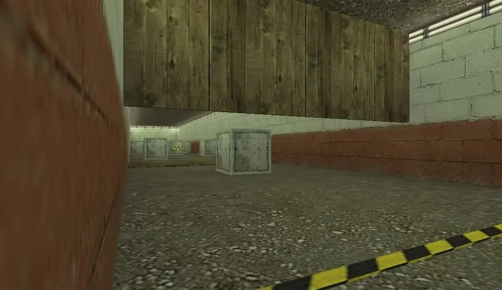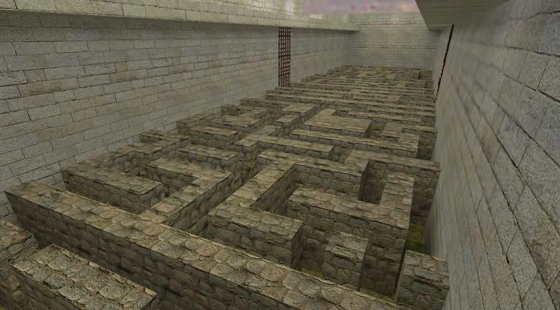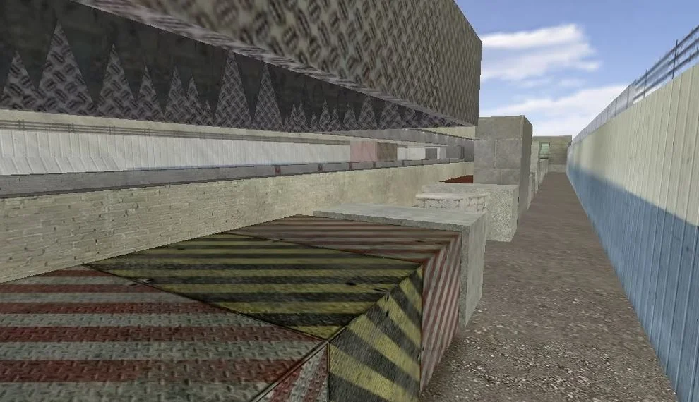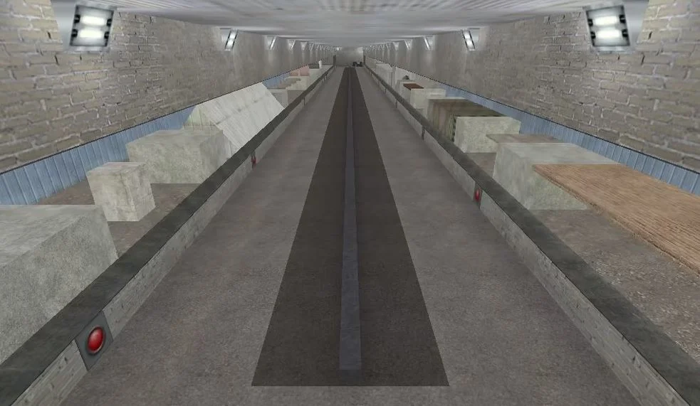 С первых мгновений становится ясно, что это не обычная карта, а смертоносный лабиринт, где каждый шаг, каждое неосторожное движение может привести к неминуемой гибели. Дизайн карты выполнен в строгом, индустриальном стиле, с преобладанием серых, бетонных текстур, металла и элементов, напоминающих строительные площадки. Основной коридор карты, по которому движутся игроки, представляет собой череду препятствий, расположенных с математической точностью. Здесь встречаются движущиеся платформы, лазерные лучи, шипы, выдвигающиеся из стен и пола, а также зоны, где включается огненная ловушка. Конструкция каждого препятствия продумана так, чтобы требовать от игрока определенного тайминга, ловкости и реакции. Часто встречаются элементы, которые вынуждают выполнять сложные прыжки или скольжения, такие как узкие мостики, вращающиеся платформы или наклонные поверхности. На протяжении всего забега игроки видят высокие, глухие стены, которые ограничивают поле зрения и создают ощущение замкнутого пространства. Эти стены, выполненные из грубого бетона, часто украшены предупреждающими знаками, такими как восклицательные знаки в квадратах или специфические символы, намекающие на опасность. Время от времени встречаются небольшие открытые участки или ниши, которые могут предложить кратковременное облегчение или, наоборот, стать местом для особо изощренных ловушек.