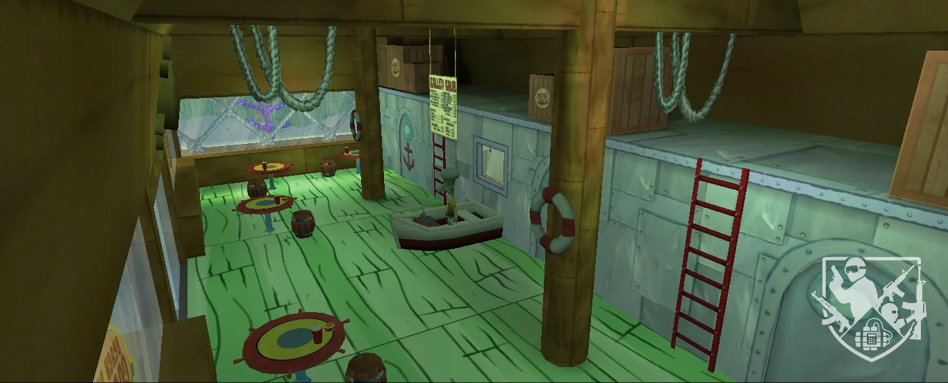 cs_krustykrab — динамичная карта для CS 1.6 по мотивам известного мультсериала. Бои проходят среди столов и машин Красти Краб, с частыми стычками и укрытиями. Режим спасения заложников заставляет игроков работать командой и проявлять ловкость в каждом раунде.