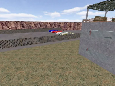 Перед нами карта, на которой развернулась динамичная гоночная трасса. На переднем плане взгляд притягивает зелёная травянистая поверхность, вдоль которой тянется ограждение из металлической сетки. За ним уже готовы к старту гоночные болиды, сверкающие синим, красным и жёлтым цветами. На заднем плане возвышается внушительная скалистая стена, надёжно ограждающая трассу. Над всем этим раскинулось чистое голубое небо, украшенное лишь несколькими пушистыми белыми облаками.