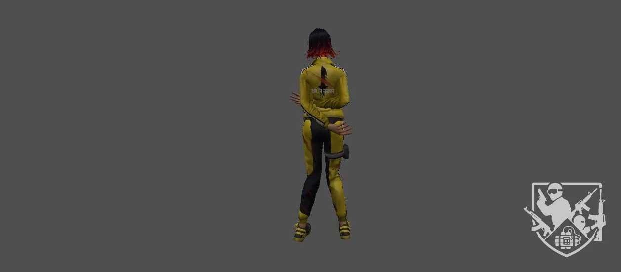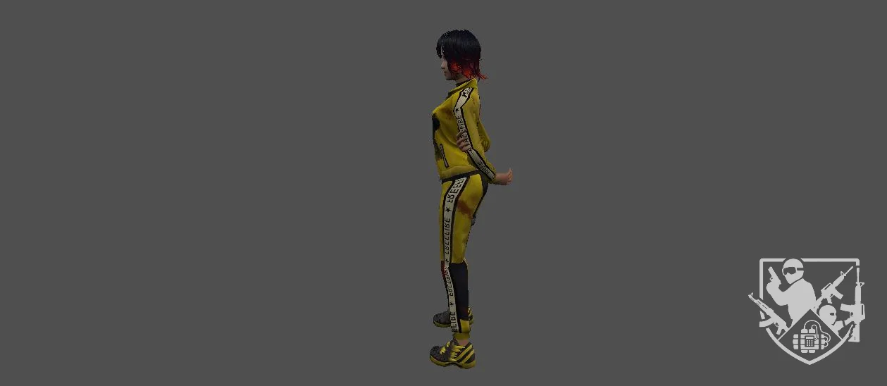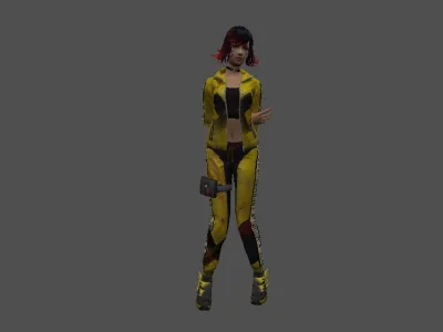 Модель «Kelly» - короткие волосы с ярко-красными прядями, обрамляющими лицо, придают ей бунтарский вид. Челка, спадающая на глаза, добавляет загадочности. Kelly предпочитает спортивный стиль, выделяясь ярко-желтым спортивным костюмом. Куртка с черными вставками и молнией, надетый поверх короткого черного топа, подчеркивает её подтянутую фигуру. Штаны в тон куртке, украшенные принтами и лампасами, дополнены красными вставками, добавляющими динамичности. На бедре закреплен небольшой кобура образный элемент, намекающий на её готовность к действию. На шее красуется тонкий черный чокер, добавляющий нотку утонченности в её образ. Спортивные кроссовки на толстой подошве, выполненные в желто-черной гамме, завершают её образ, соответствующий её стремительному характеру.