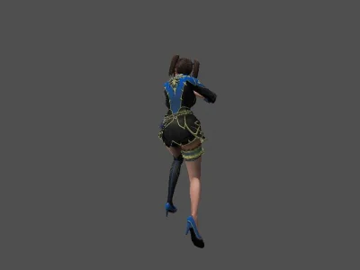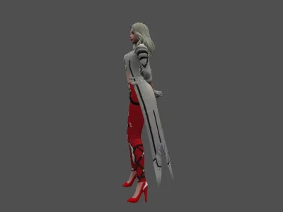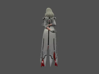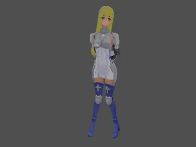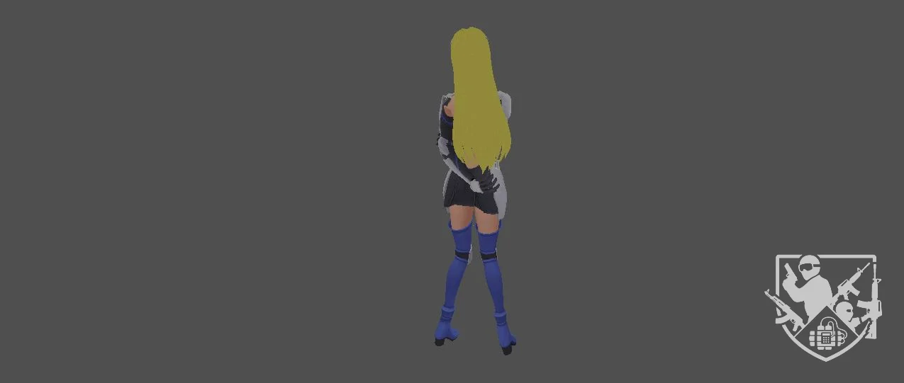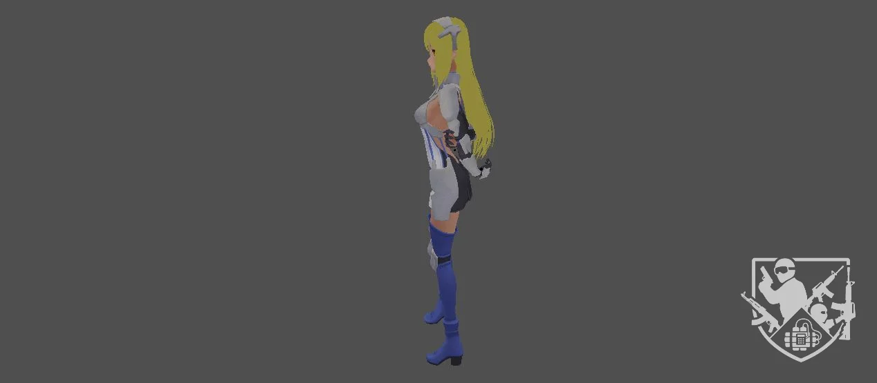 Модель «Айз Валленштайн» - волосы Айз Валленштайн, окрашенные в яркий, медовый блонд, ниспадают на плечи, обрамляя её нежное, но решительное лицо. Они выглядят ухоженными и придают ей свежий, юный вид, который контрастирует с её боевым обмундированием. Её костюм выполнен в футуристическом стиле, сочетая белый и синий цвета с металлическими вставками. Основа — облегающий белый комбинезон с короткими штанинами, который подчеркивает стройность её фигуры. Поверх этого надет стилизованный нагрудник серебристого цвета, напоминающий броню, который защищает верхнюю часть тела. Синие элементы, такие как высокие чулки, украшенные крупными белыми крестами, и перчатки, добавляют контраста и акцентируют её длинные ноги. Небольшой серый элемент, напоминающий кобуру или дополнительный защитный элемент, закреплен на бедре. В целом, её одежда выглядит не просто декоративной, но и функциональной, словно предназначенной для боя.