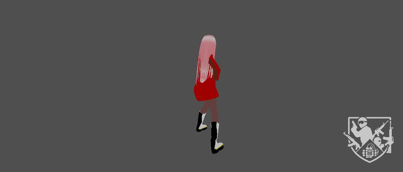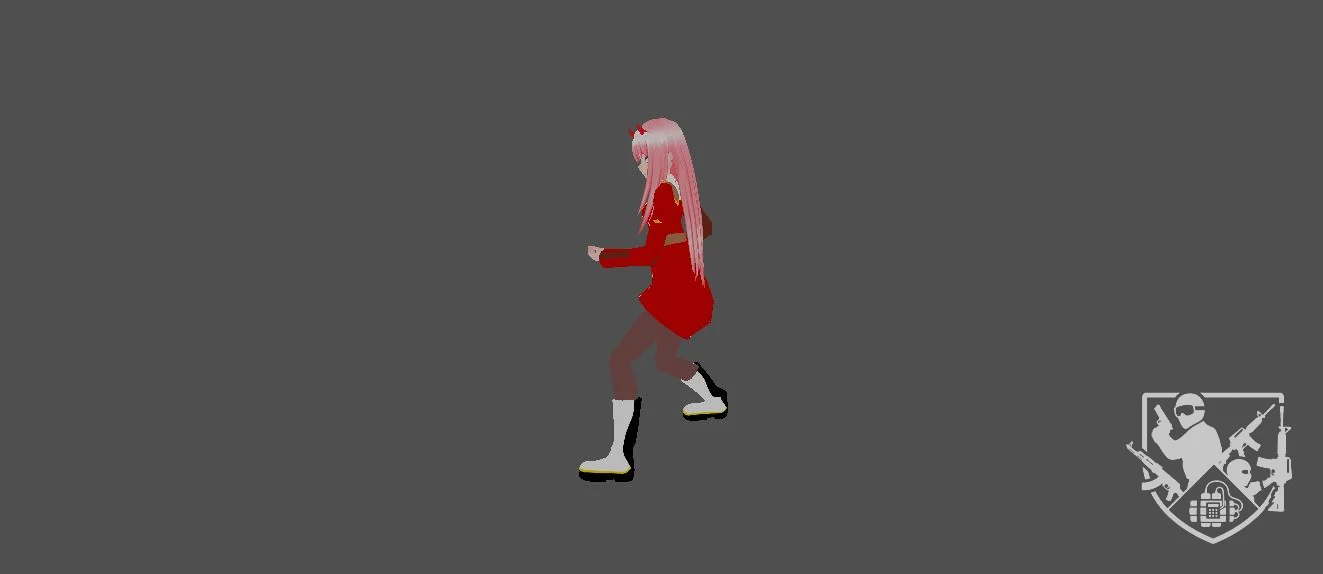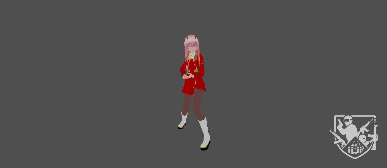 Модель «Zero Two» - персонаж облачен в узнаваемый красный военный китель, чьи четкие линии и контрастные золотистые элементы фурнитуры подчеркивают её статус и дисциплинированную натуру. Текстуры ткани передают плотность и функциональность форменной одежды, которая, несмотря на свой утилитарный дизайн, смотрится на героине как изысканный наряд. Розовый каскад волос, подчеркнутый характерными «рожками», сразу же выделяет модель из ряда стандартных игровых ассетов, делая её визуально доминирующей и моментально распознаваемой в любом контексте.
