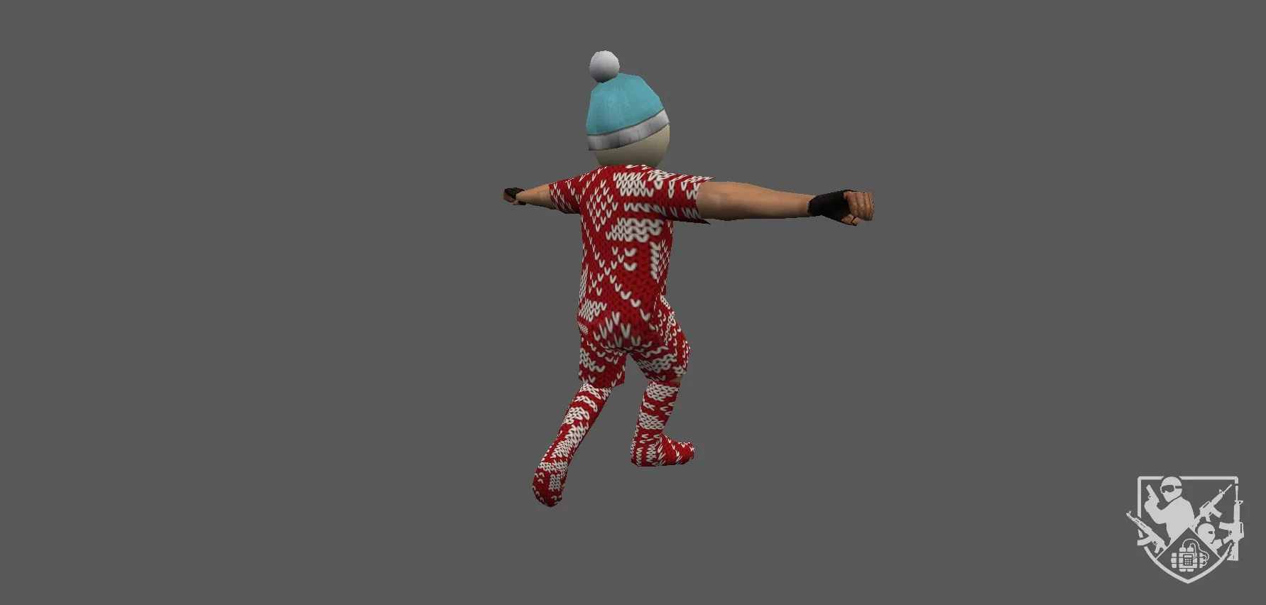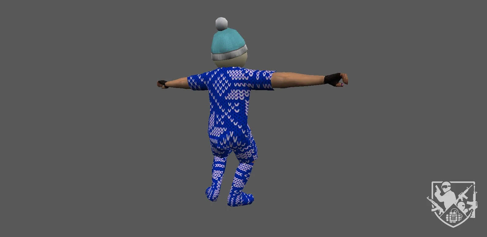 Тело одето в тёмную тактическую одежду с элементами обледенения: на плечах, руках и груди видны налёты инея и ледяные кристаллы. Текстуры матовые с холодными бликами, подчёркивающими зимнюю атмосферу. Движения персонажа кажутся немного тяжёлыми и “хрустящими”, будто каждый шаг сопровождается скрипом льда. В целом модель создаёт образ безмолвного, холодного бойца, словно пришедшего из замёрзшего мира.
