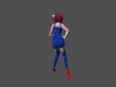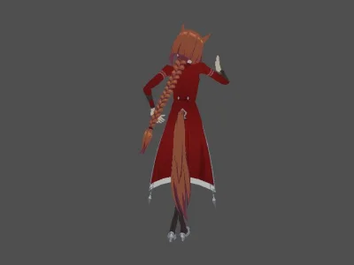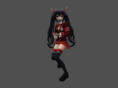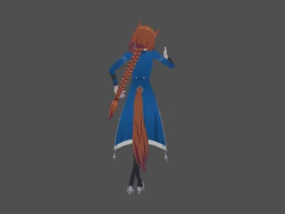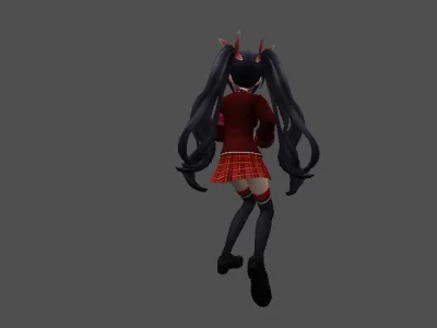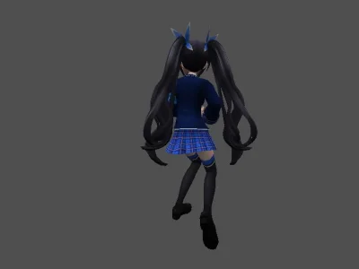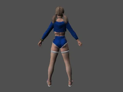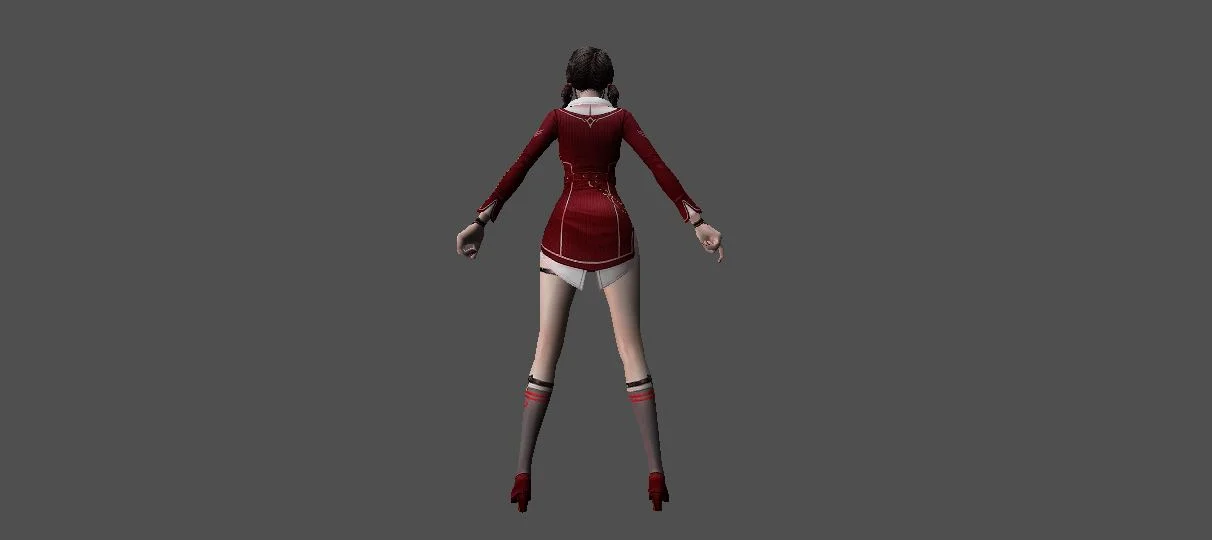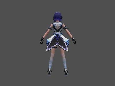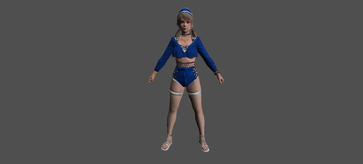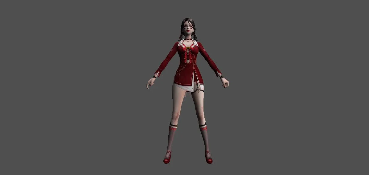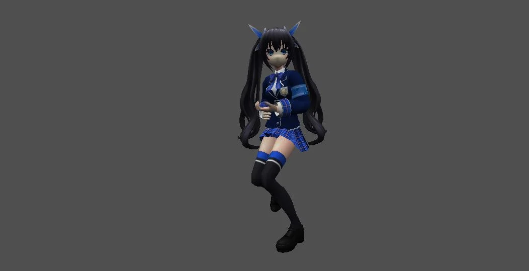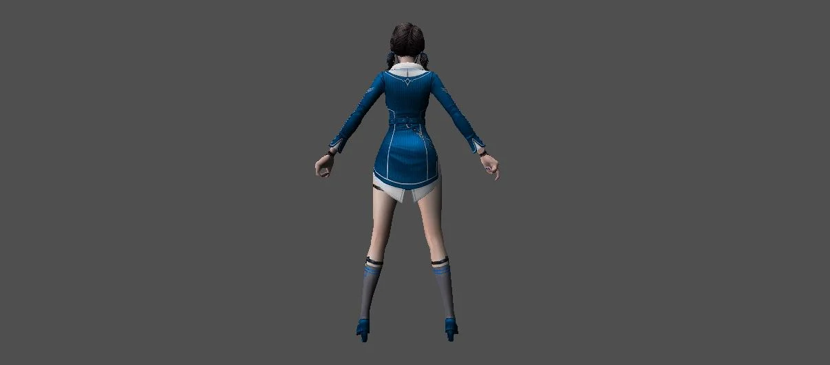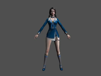 Модель «Princess Choi Ji Yoon KT/TT» - визуальный образ модели сочетает в себе школьную форму и элементы, придающие ей аристократизм. Основной костюм выполнен в глубоком синем цвете, напоминающем школьный блейзер, с белыми контрастными вставками, которые подчеркивают его структуру. Пиджак имеет приталенный силуэт, расширяющийся к бедрам, что создает элегантный контур. Воротник украшен белым кантом и небольшой подвеской, добавляющей изысканности. Рукава заканчиваются белыми манжетами, а поверх синего пиджака виднеется белый топ с V-образным вырезом. Под пиджаком скрывается короткая юбка или шорты белого цвета, дополненные декоративными ремешками, которые придают костюму некоторую дерзость. На ногах модель носит высокие серые чулки с синей полосой у края, а также изящные синие туфли на каблуке. Очки с круглой оправой, надетые на нос, добавляют образу интеллектуальный и немного загадочный вид. Волосы собраны в две аккуратные косички, обрамляющие лицо, что придает ей юный и одновременно дисциплинированный вид.