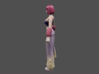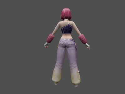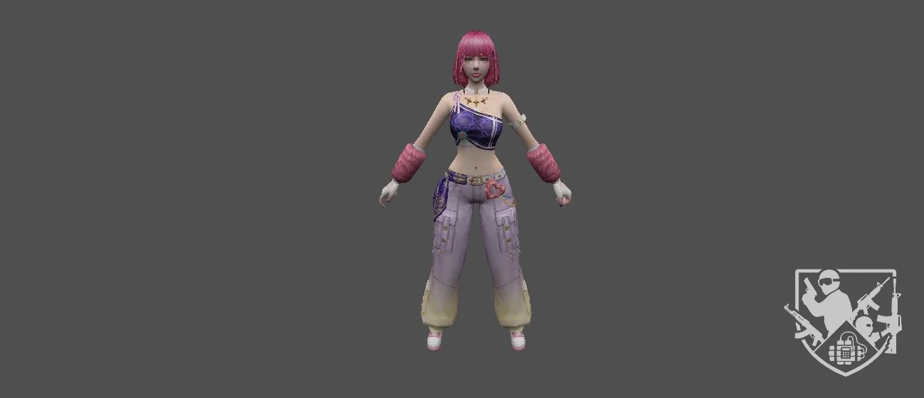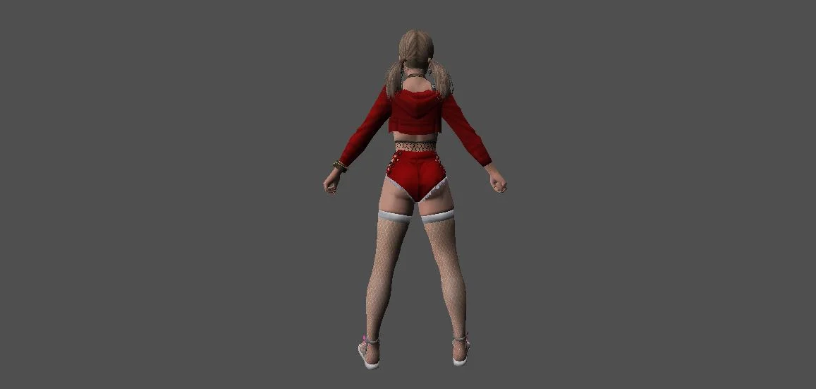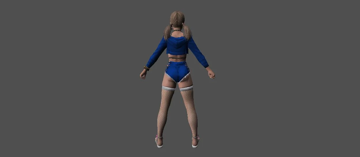Модель «DOA Amy Gal Outfit KT/TT» - Центральным элементом образа является короткая синяя кофта с длинными рукавами, выполненная в стиле кроп-топ. Этот предмет одежды открывает живот, подчеркивая фигуру. На груди кофты расположен декоративный элемент, напоминающий шнуровку контрастным белым цветом, а по краю выреза виден белый кант. Такой дизайн придает наряду игривость и некоторую пикантность. Ниже кофты располагаются синие шорты с высокой талией. Их боковые части украшены декоративными элементами, напоминающими шнуровку через люверсы, выполненную белым шнуром. Это придает шортам модный и дерзкий вид. Поверх шорт надеты черные сетчатые колготки или чулки, которые своим узором добавляют текстуры и визуального интереса.