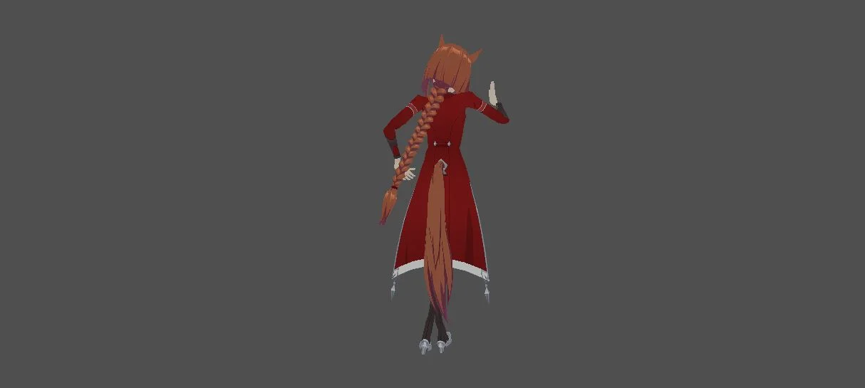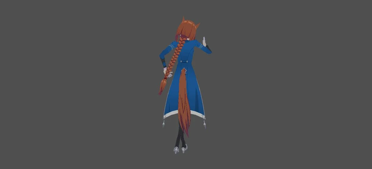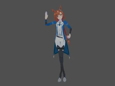 Модель «Ikuno Dictus» - рыжеватые волосы, заплетенные в длинную косу, и украшающие голову характерные ушки намекают на связь с хитрой лисой. Элегантный наряд модели выполнен в стиле, напоминающем униформу или торжественное одеяние. Белый жилет с черным воротником и галстуком, поверх которого надет синий пиджак с белыми манжетами и золотистой отделкой, создает образ строгости и элегантности. Белые брюки с черными лампасами и черные чулки подчеркивают стройность фигуры, а серые туфли завершают образ. Дизайн модели «Ikuno Dictus» демонстрирует внимание к деталям, от строгой линии одежды до тонких элементов, таких как золотистая цепочка на жилете и маленькие украшения на ушах.