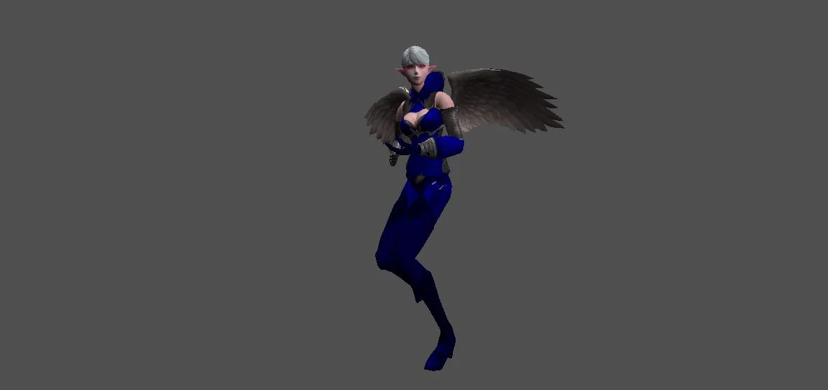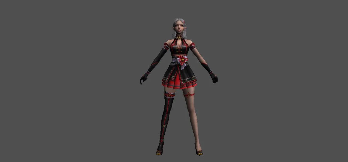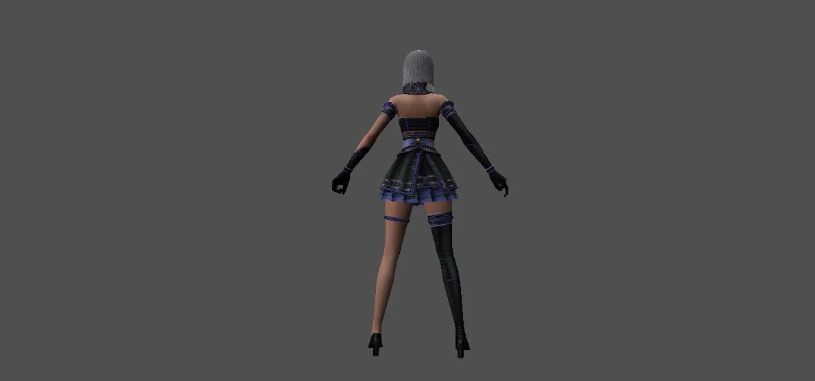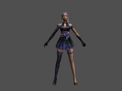 Модель «Девушка Эльф» - данный облик был воплощением грации и таинственности, словно сама природа решила создать совершенство, соединив в нём утончённость лесных нимф и загадочность ночной тени. Одежда эльфийки, подобно закатному небу, переливалось оттенками полуночи и сирени. Верхняя часть наряда, короткий, облегающий лиф, была выполнена из чёрной ткани, украшенной сложным узором из золотых нитей, напоминающим звёздную карту. Глубокий вырез, подчёркнутый высоким воротником, придавал образу некую смелость, но в то же время сохранял изысканность. Рукава, прикрывающие лишь предплечья, были сшиты из тонкой, полупрозрачной ткани, которая словно растворялась в воздухе, оставляя открытыми изящные запястья, украшенные изящными браслетами.