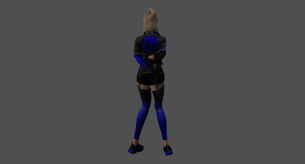 Модель «Фурия» - облик – это симбиоз современных тенденций и боевой готовности, сотканный из ночных теней и вспышек неонового света. Данный наряд, словно вторая кожа, облегал стройное, подтянутое тело, демонстрируя предельную функциональность и агрессивную элегантность. Короткий, обрезанный жакет, выполненный из чёрной, глянцевой ткани, напоминающей высокотехнологичный материал, обрамлял её торс. Синие светящиеся вставки, словно неоновые линии, обрамляли воротник-стойку и переходили на диагональные разрезы на рукавах, добавляя образу футуристичности. Эти линии, пульсирующие мягким, холодным светом, казалось, отражали внутреннюю энергию Фурии, её готовность к стремительному броску.