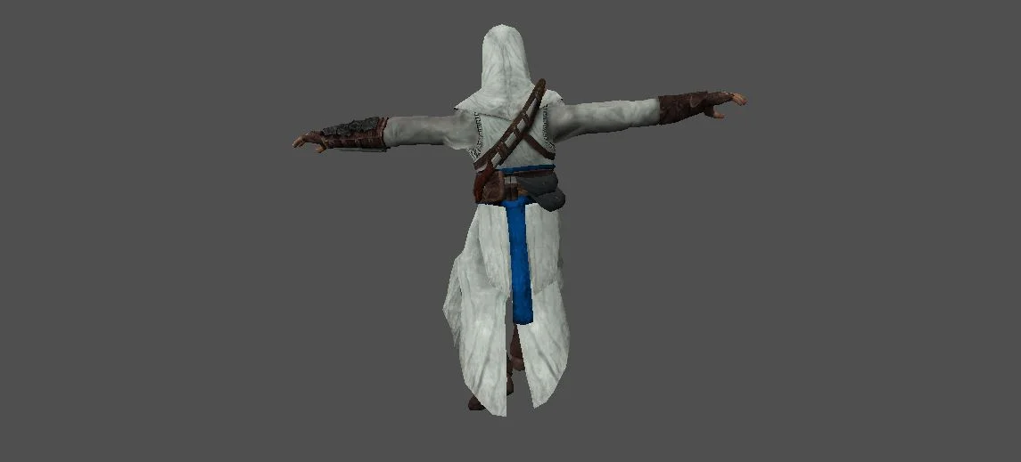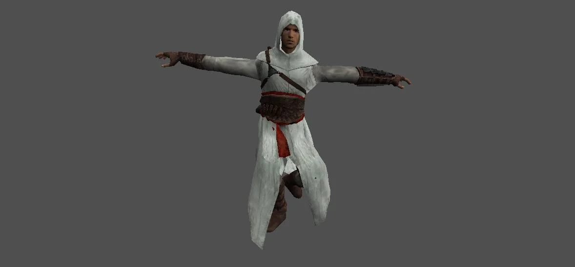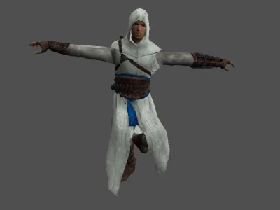 Модель «Альтаир» - его облик это сплав простоты и функциональности, пробуждающий дух благородных воинов и скрытых гильдий. Основу его одеяния составляет просторная белая туника с глубоким капюшоном, который мягко оберегает лицо от посторонних взглядов, придавая облику загадочность. Этот капюшон, словно ореол, обрамляет вытянутое овальное лицо с чёткими чертами, выдавая его истинную расу – человека, закалённого в боях и жизни. Материал туники, кажется, соткан из тонких нитей, что придаёт ей лёгкость, но вместе с тем и прочность, позволяя свободное движение.
