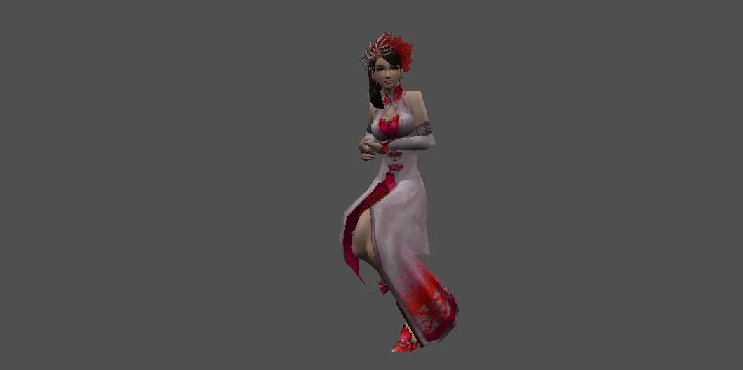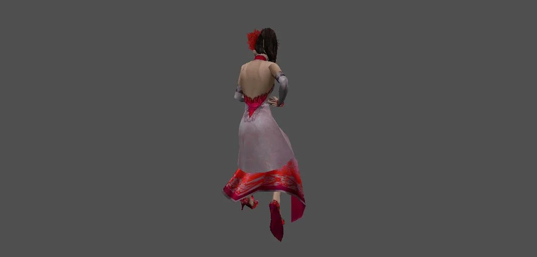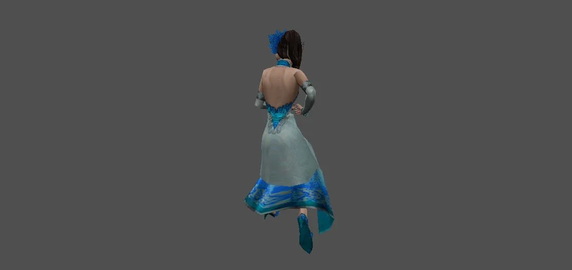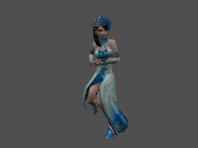 Модель «Vanessa» - наряд, словно сотканный из лунного света и нежных морских волн, подчеркивает утонченность и грацию. Основа её платья – струящаяся ткань, преобладающего белого цвета, с глубоким вырезом, обрамленным изящным голубым узором, напоминающим распускающиеся цветы или морские гребни. Этот узор, выполненный в насыщенных бирюзовых и лазурных оттенках, придает наряду загадочность и глубину. По бокам платья расположены высокие разрезы, открывающие стройные ноги, на которых видны декоративные элементы, повторяющие узор на груди. Рукава платья длинные, облегающие, отделанные белым материалом, создавая контраст с основной тканью. Особенностью её образа является головной убор – сложная конструкция из синих и серебристых перьев или декоративных элементов, напоминающих фантазийный цветок или морскую раковину. Этот убор придает Ванессе царственный вид и подчеркивает её индивидуальность. Волосы, собранные в высокую прическу, изящно обрамляют лицо, а несколько прядей ниспадают на плечи, добавляя образу легкую небрежность.