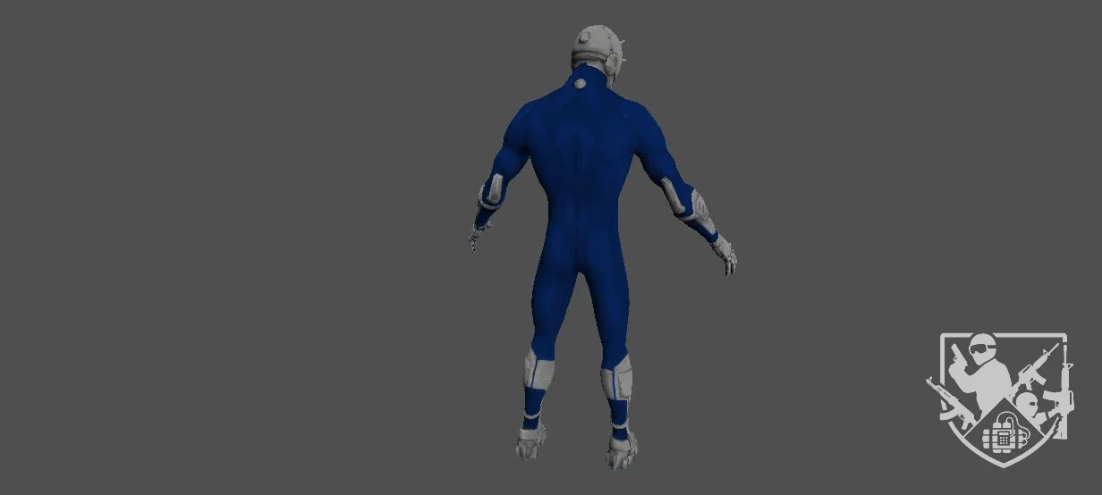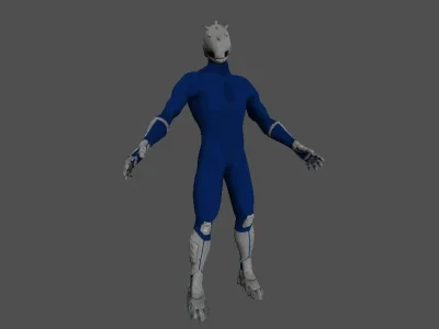 Модель «Speed Robot» - этот цветовой выбор придает роботу спортивный и динамичный вид, намекая на его основное предназначение — стремительное движение. Голова робота выполнена в контрастном сером цвете, напоминая шлем или маску. Её форма гладкая, с острыми, выступающими элементами, напоминающими шипы или антенны, которые придают роботу некую агрессивность и готовность к экстренным ситуациям. Отсутствие явных черт лица, таких как глаза или рот, усиливает ощущение его механической природы и таинственности. Конечности робота сочетают в себе синий материал костюма и серые, вероятно, металлические элементы. На руках, в области предплечий, расположены серые манжеты, которые продолжаются до самих кистей, где пальцы также выполнены в этом более твердом, защитном материале. Это намекает на улучшенную механику рук, способную к выполнению точных или силовых действий. В целом, «Speed Robot» — это образ, вызывающий ассоциации с будущим, скоростью и технологическим прогрессом, что делает его привлекательным.