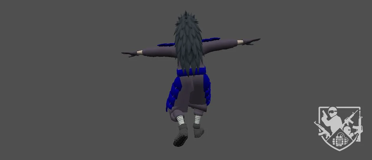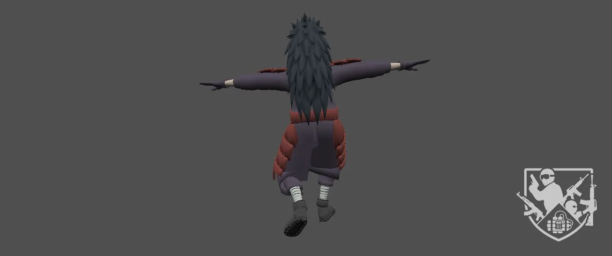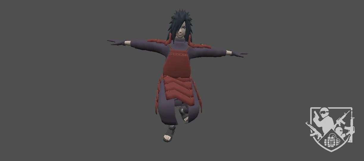 Модель «Madara» - основой образа Мадары является его характерное снаряжение, вдохновлённое доспехами самураев. Многослойная броня, состоящая из сегментированных пластин, как на груди, так и на бёдрах, придаёт ему вид непоколебимого воина. Эти доспехи, выполненные в тёмно-синих или красных тонах, в зависимости от вариации, не только защищают, но и визуально подчеркивают его статус и весомость. Под броней — свободная, но облегающая одежда, типичная для ниндзя, позволяющая совершать быстрые и ловкие движения.