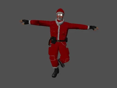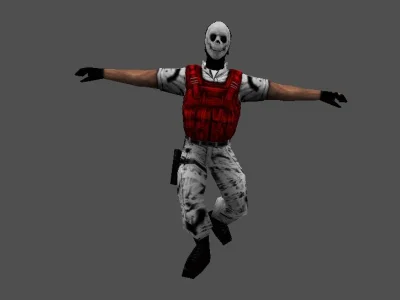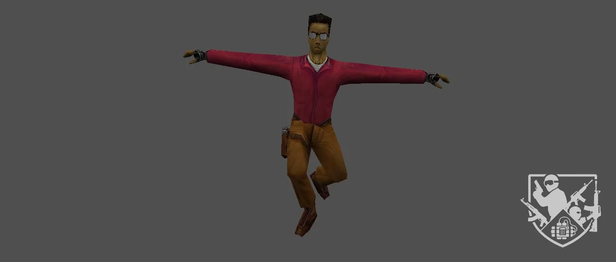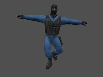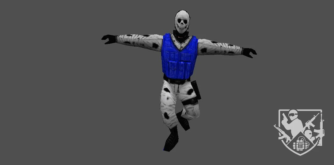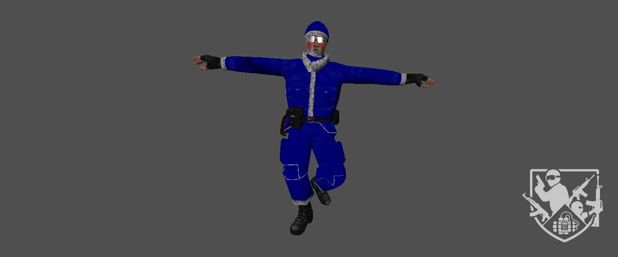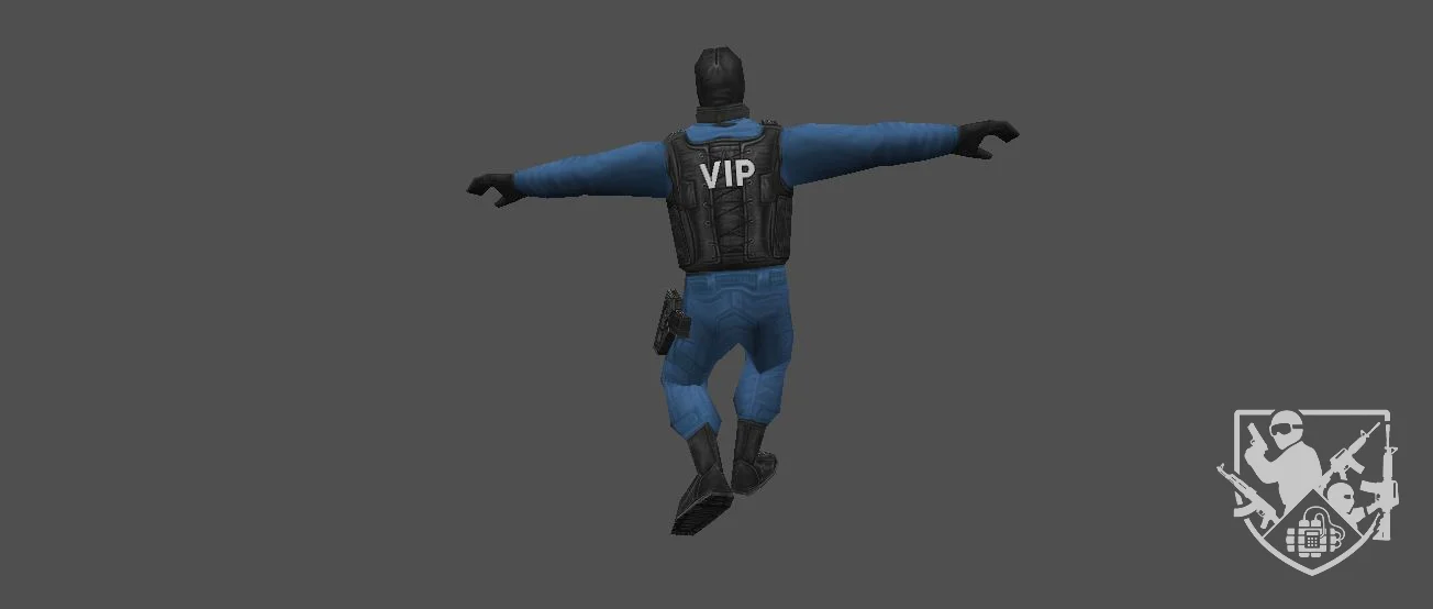 Модель «Стандартная модель VIP» - выполнена модель в двух вариациях, первое, демонстрирует модель в голубой униформе, состоящей из штанов и рубашки, поверх которых надет черный тактический жилет. На ногах — черные ботинки, что подчеркивает практичность и боевую готовность персонажа. Этот образ идеально вписывается в роль бойца спецподразделения или другого вооруженного персонажа, где функциональность и узнаваемость являются приоритетом.