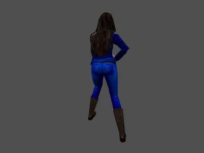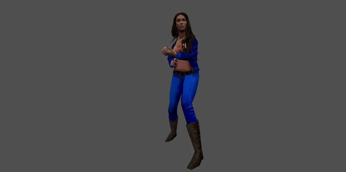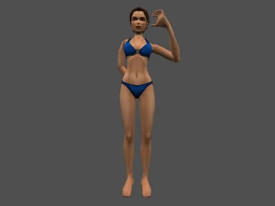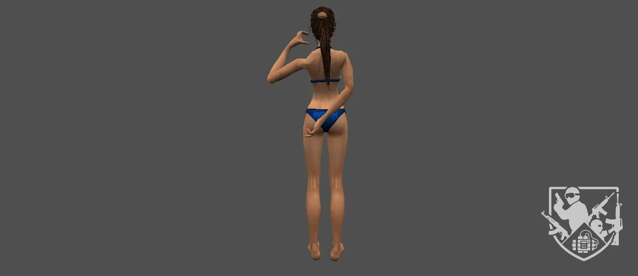 Модель «Lesly» - фигура «Lesly» стройная, вытянутая, с акцентом на длинные ноги и тонкую талию. Пропорции тела слегка преувеличены, что типично для стилистики, в которой выполнена модель. Модель одета в бикини приглушённого синего цвета. Купальник состоит из двух частей: бюстгальтера с треугольными чашечками и трусиков-стрингов. Детализация одежды минимальна, текстура бикини выглядит простой, напоминающей узор в мелкую клетку или точки. Черты лица «Lesly» резко очерчены, с выраженными скулами и подбородком. Глаза кажутся устремлёнными вдаль или в сторону, создавая загадочное выражение. Волосы коротко стрижены, тёмного цвета, уложены назад, открывая шею и плечи.