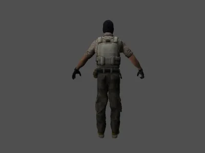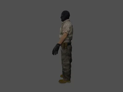 Нижняя часть его экипировки состоит из комбинезона цвета хаки, который, судя по всему, является его основной одеждой. На коленях он носит защитные накладки, что типично для активных боевых действий, где часты падения и передвижения на близких дистанциях. Брюки также оснащены множеством карманов, что повышает их практичность. На ногах у него прочные, тактические ботинки, которые выглядят изношенными, но надежными, готовыми к любым условиям.