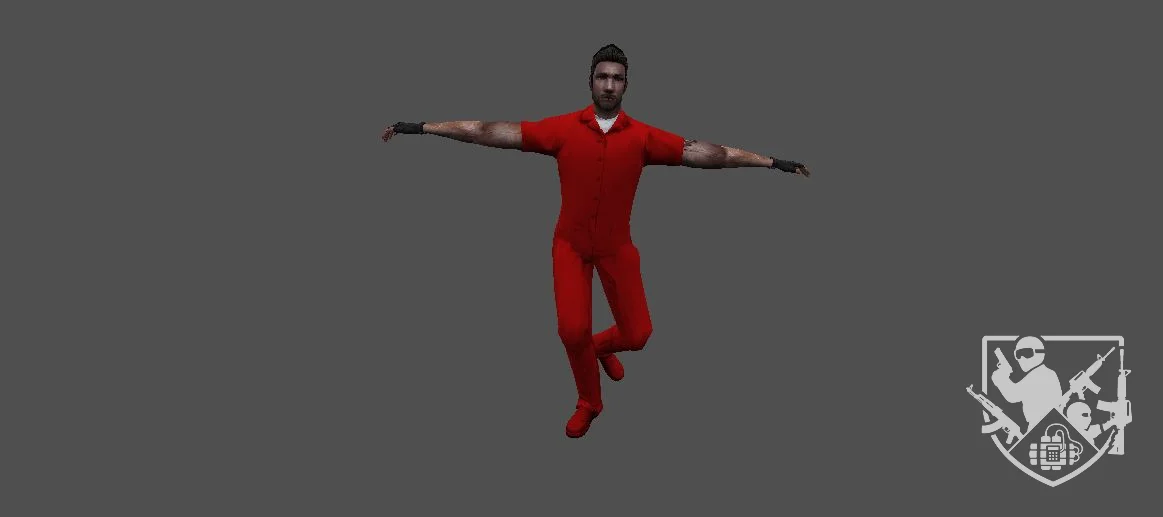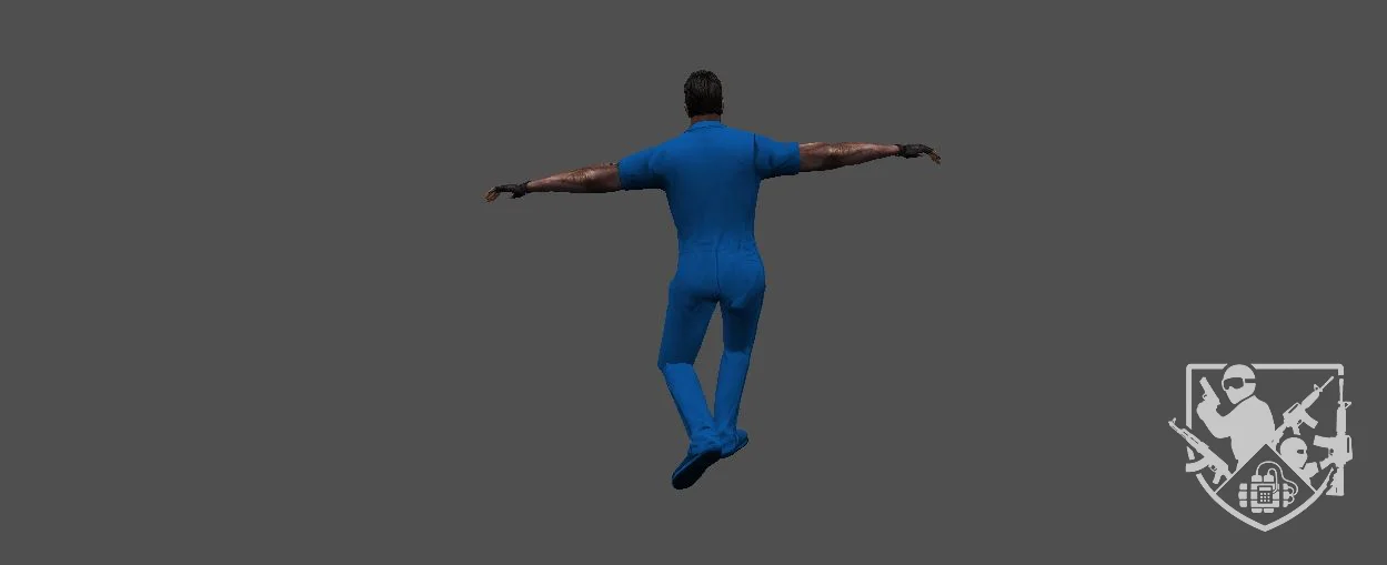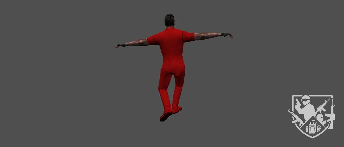 Модель «Заключенный» - доминирующим элементом образа является комбинезон — стандартизированная рабочая одежда, часто ассоциируемая с местами лишения свободы. Наличие двух вариаций, в синем и красном цвете, может указывать на разные типы заключённых, их статус или сферу деятельности внутри учреждения. Простой крой, отсутствие лишних деталей и прочный материал подчёркивают утилитарность и практичность такой одежды, призванной выдерживать тяжёлые условия.