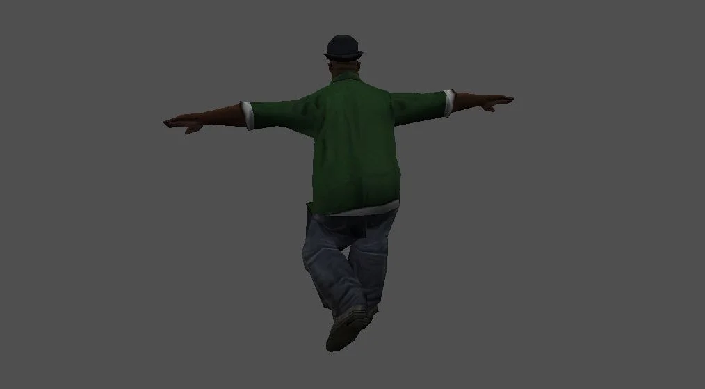 Модель «Big Smoke» - Перед нами скин с крепким телосложением, облачённый в узнаваемый наряд. Его верхняя часть — зелёная рубашка, чьи рукава элегантно засучены, демонстрируя белую изнанку. Голову украшает классическая чёрная шляпа-котелок, а взгляд скрывают очки с выразительными квадратными линзами. Завершают образ серые джинсы и надёжные серые ботинки.