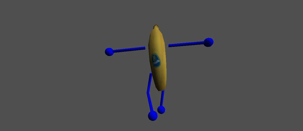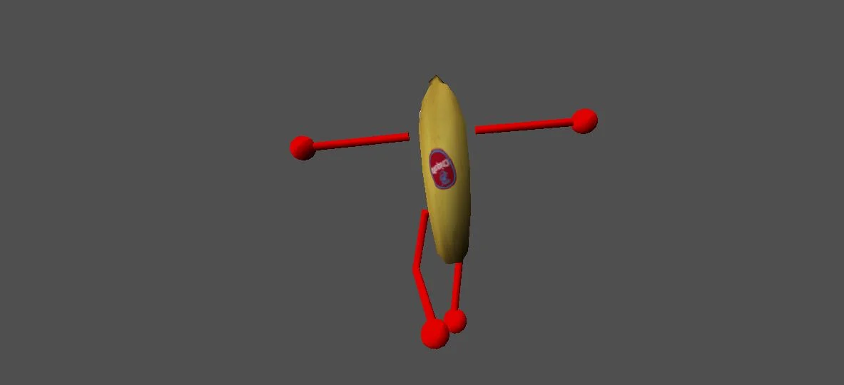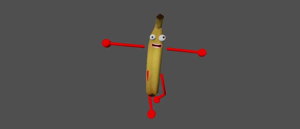Модель «Банан» - центральной частью модели является, конечно же, сам банан. Его тело имеет характерную изогнутую форму, окрашенную в узнаваемый желтый цвет. Однако, поверхность банана не идеальна: она испещрена мелкими темными точками и неровностями, что придает ему вид слегка перезрелого, но все еще бодрого фрукта. На стволе банана присутствуют синие, прямоугольные вставки, которые выполняют роль рук и ног. У банана ярко выраженное, почти мультяшное лицо, которое придает ему человеческие черты и эмоции. Огромные, широко распахнутые голубые глаза, слегка выпученные, излучают не то удивление, не то испуг, а может быть, и то, и другое одновременно. Зрачки смещены в стороны, усиливая комический эффект. Рот банана открыт в крике или в радостном возгласе, обнажая ряд мелких, белых зубов. Его выражение лица — это смесь наивности и легкой паники, что делает его образ особенно запоминающимся.