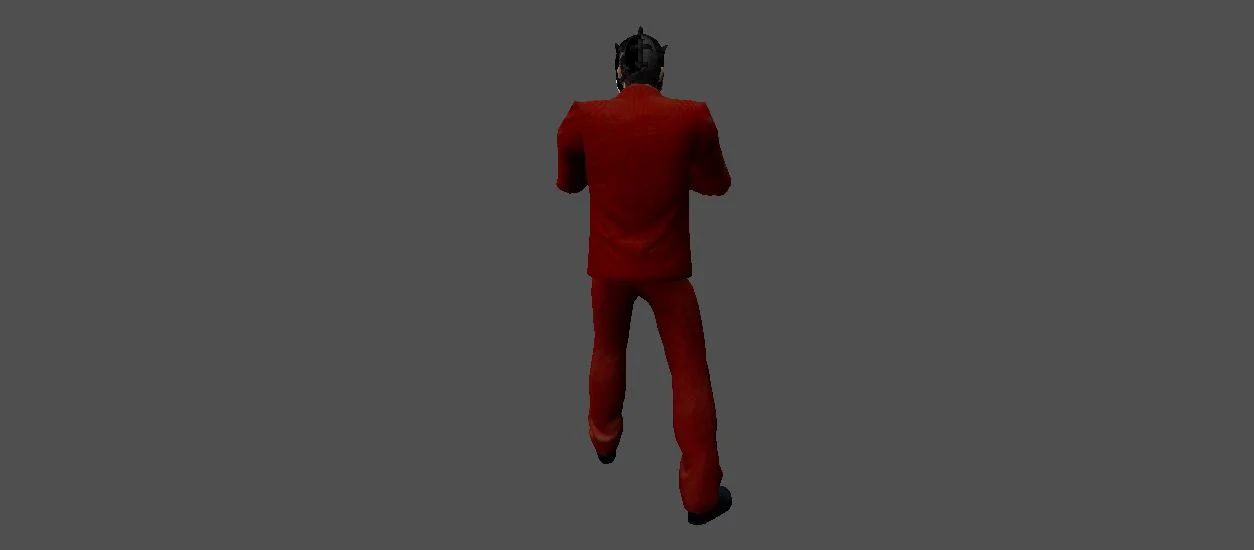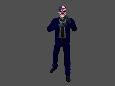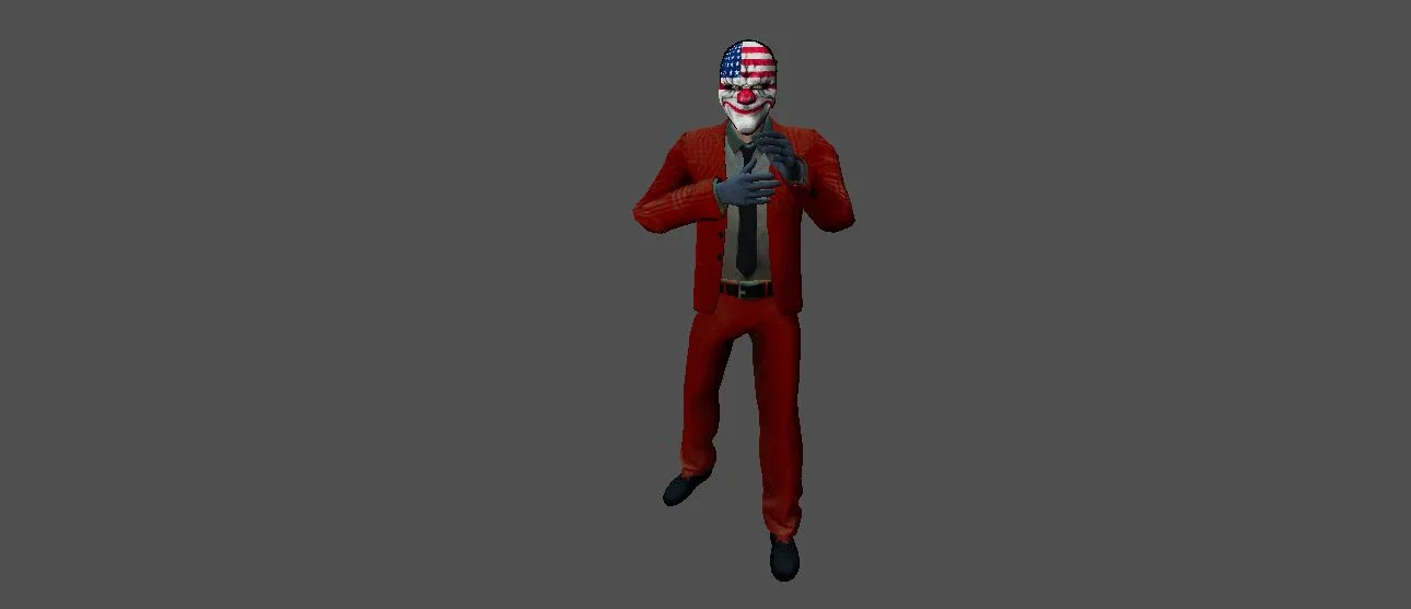 Модель «Dallas Payday 2» - главным элементом облика Далласа является его маска. Это не простое прикрытие, а своего рода визитная карточка, несущая в себе яркий дизайн. Маска украшена американским флагом – красно-белыми полосами и синим полем со звездами, что придает ей патриотический, но в то же время и вызывающий вид. Дополняют ее яркие, вызывающие мазки: круглые красные щеки, напоминающие клоунский грим, и черные линии, обводящие глаза и рот, создавая гротескный, почти зловещий образ. Эта маска, скрывая истинное лицо, одновременно подчеркивает его роль в команде – быть неузнаваемым, но решительным исполнителем. Поверх маски на Далласе надет классический синий костюм, который, несмотря на свою формальность, выглядит так, будто создан для действий, требующих гибкости и скорости. Пиджак строгого кроя, с лацканами, сочетается с брюками того же цвета. Под пиджаком виднеется белоснежная рубашка и черный галстук, завязанный строгим, но несколько небрежным узлом. Эта комбинация одежды придает ему вид профессионала, который, однако, готов в любой момент перейти к более решительным действиям. На руках у Далласа надета пара светло-серых перчаток, которые добавляют его образу завершенность и, возможно, служат для сохранения отпечатка пальцев или лучшего захвата.