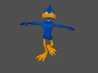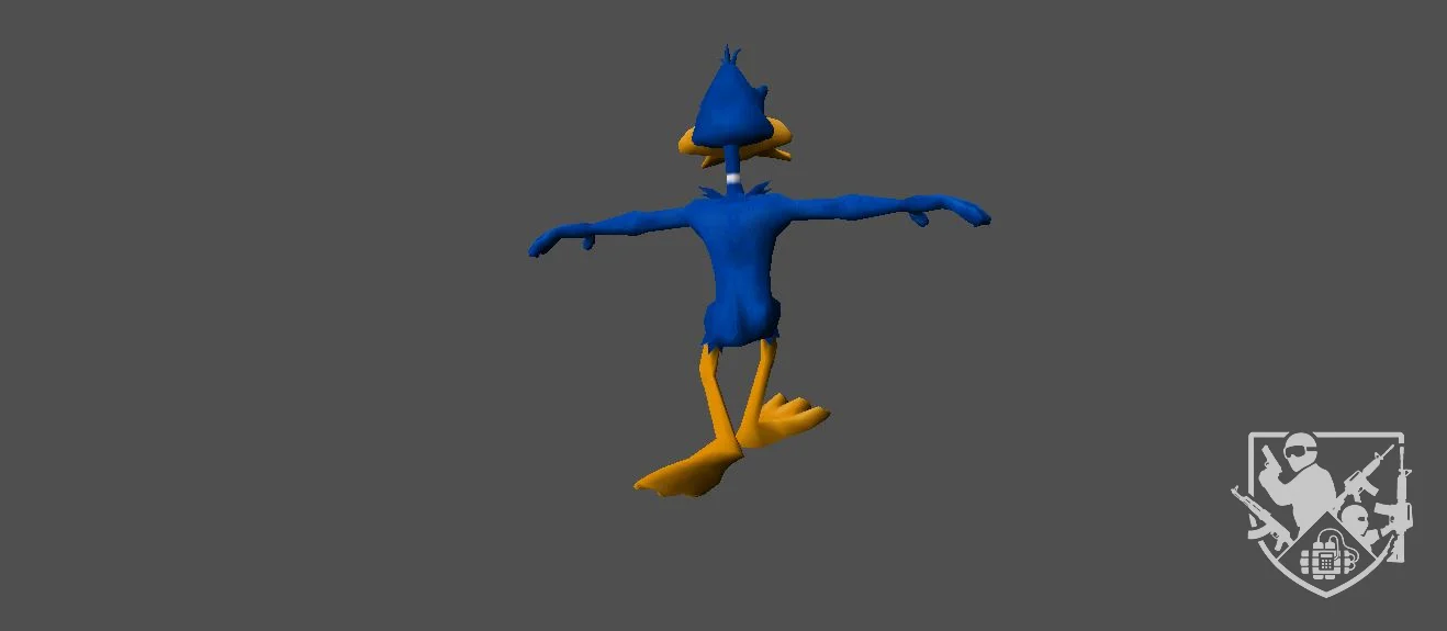 Модель «Duffy Duck» - основной цветовой палитрой персонажа является насыщенный синий цвет, покрывающий его тело, за исключением хохолка на голове, который также выполнен в этом оттенке, но с более острыми, стилизованными перьями, придающими утенку агрессивный вид. Ключевой деталью, несомненно, является его характерный утиный клюв, выполненный в ярко-желтом цвете. Этот элемент, наряду с острыми, выразительными бровями, формирует узнаваемое выражение лица – смесь удивления, гнева и решимости. Белая полоска на шее придает дополнительный контраст и акцентирует внимание на голове персонажа. Ноги и ступни модели окрашены в тот же яркий желтый цвет, что и клюв. Ступни имеют характерное для утиных лап строение, что подчеркивает принадлежность персонажа к виду водоплавающих. Длинные, тонкие ноги, в сочетании с раскинутыми в стороны руками, создают впечатление динамики, словно утенок застыл в движении, готовясь к стремительному рывку или неожиданному маневру. Все эти детали, от острых перьев на хохолке до характерной формы ступней, придают модели "Duffy Duck" индивидуальность и делают ее привлекательной для различных областей применения, будь то анимация, игры или другие проекты.