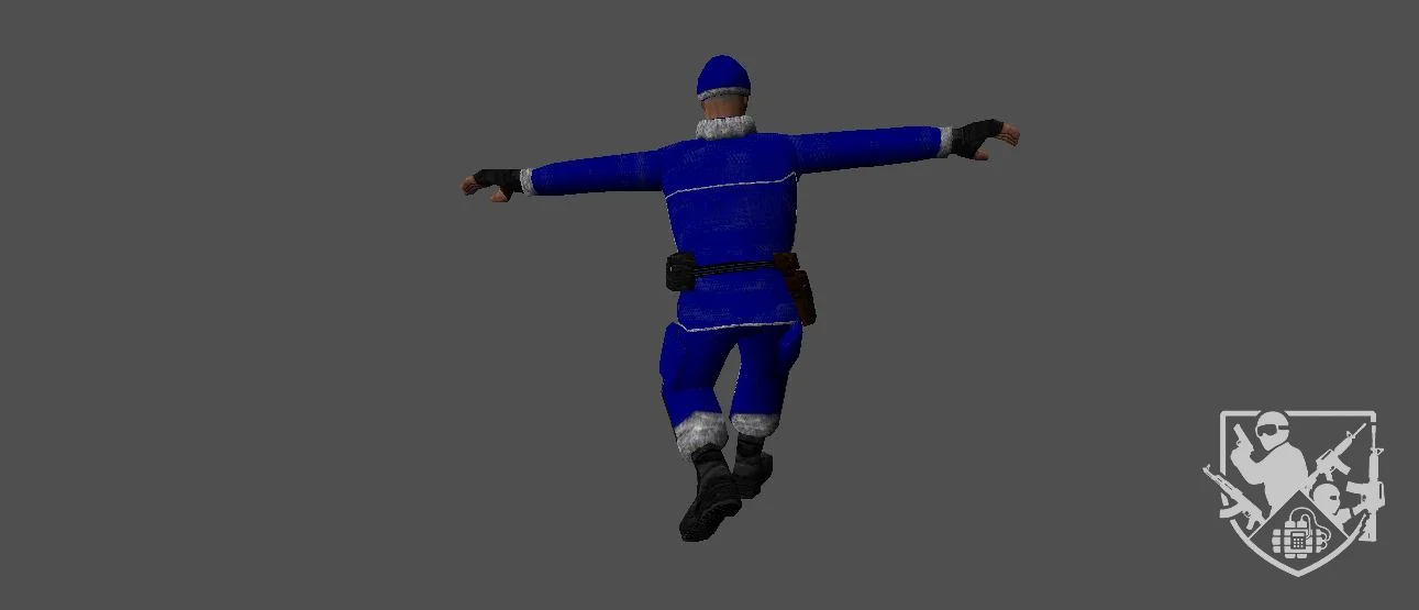 Эта оторочка присутствует на воротнике, манжетах, подоле куртки и штанин, а также на шапке. Белая опушка придает костюму праздничный вид, но в сочетании с остальными деталями создает удивительный контраст. «Santa Ops» — это удивительное сочетание рождественской тематики и милитарного стиля, создающее яркий и запоминающийся образ. Он может использоваться как для шуточных, так и для серьезных игровых сценариев, где требуется необычный персонаж с элементами неожиданности.
