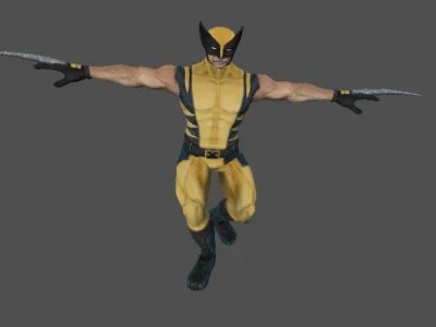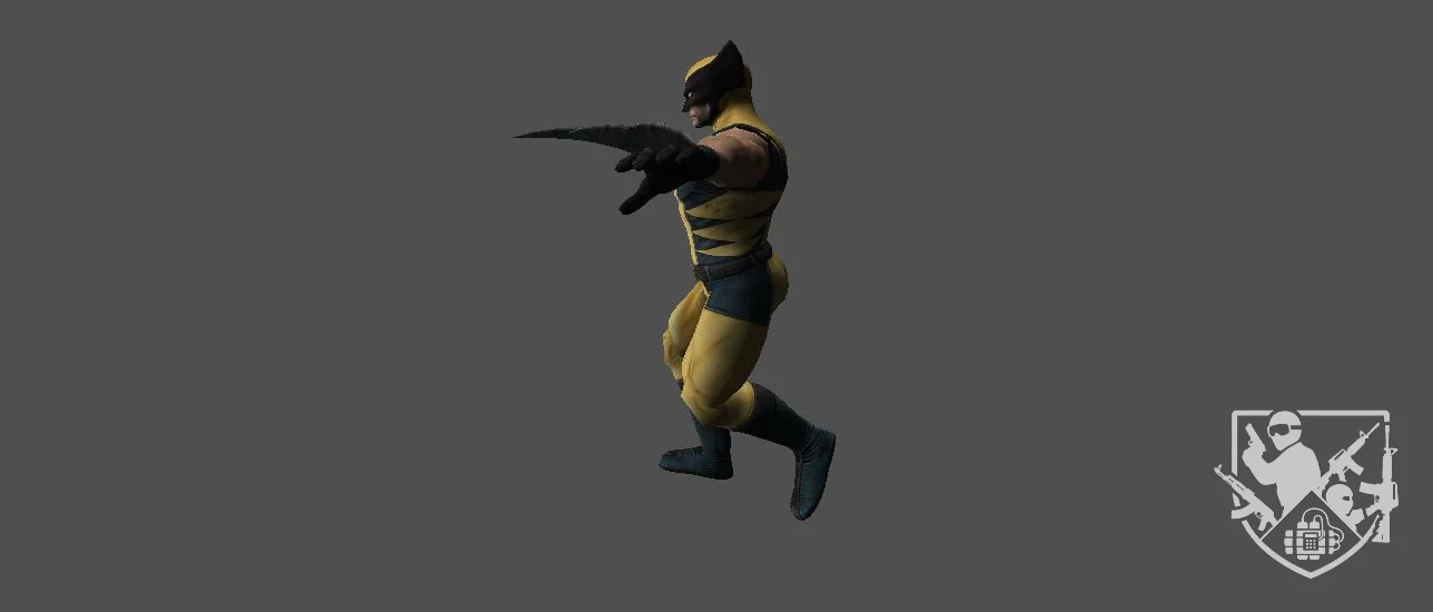 Модель «Росомаха» - центральное место в дизайне занимает костюм Росомахи: облегающий желтый комбинезон с характерными черными полосами, имитирующими мышечную структуру, и синими элементами, такими как пояс с отличительным символом «X» и наручи. Маска с острыми черными заострениями на голове, полностью скрывающая лицо, подчеркивает его скрытность и звериную натуру. Образ дополнен черными перчатками и мощными ботинками, также в сине-черной гамме. Особое внимание уделено ключевой детали — выдвижным когтям. Из-под перчаток на каждой руке выходят по три острых, зазубренных металлических лезвия, готовых к атаке. Их текстура и острота переданы с высокой степенью реализма, что намекает на смертоносную силу и боевую готовность персонажа. Поза, в которой представлена модель, — раскинутые в стороны руки с выпущенными когтями, — демонстрирует его готовность к бою и динамичность, присущую Росомахе.