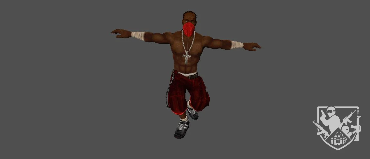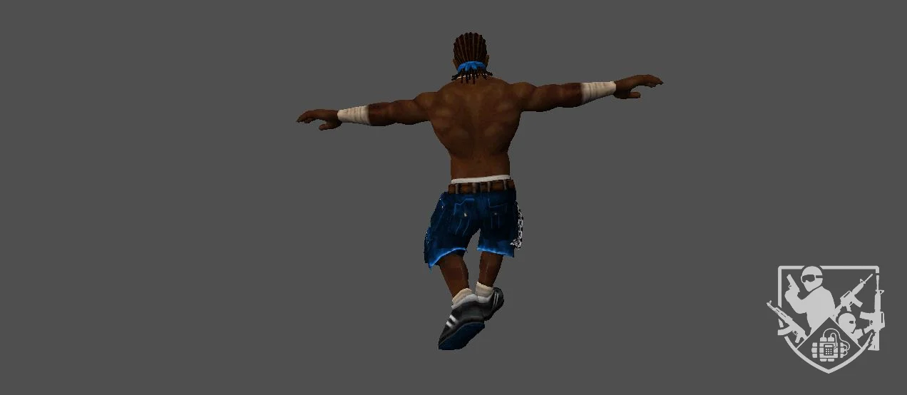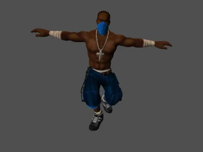 Модель «Def Jam» - его торс обнажен, демонстрируя рельефные мышцы, покрытые гладкой, темной кожей. Это подчеркивает его боевую подготовку и дикую энергию, которая, кажется, исходит от него. Нижняя часть его одежды — это широкие синие мешковатые штаны, типичные для уличного стиля. Они свободны и удобны, не сковывают движений, что идеально подходит для динамичных движений и борьбы. На штанах видны детали, намекающие на их прочность и функциональность, возможно, дополнительные карманы или декоративные элементы, характерные для уличной моды. Пояс с металлической пряжкой добавляет завершающий штрих к его образу, подчеркивая его индивидуальность. Особое внимание привлекает украшение на шее — массивный серебряный кулон в форме креста. Это не просто модный аксессуар, а символ, который может нести в себе глубокий смысл, будь то религиозная вера, личная философия или просто элемент самовыражения. Кулон, сверкая на солнце, добавляет контраста к его смуглой коже, привлекая взгляд к его сильной груди.