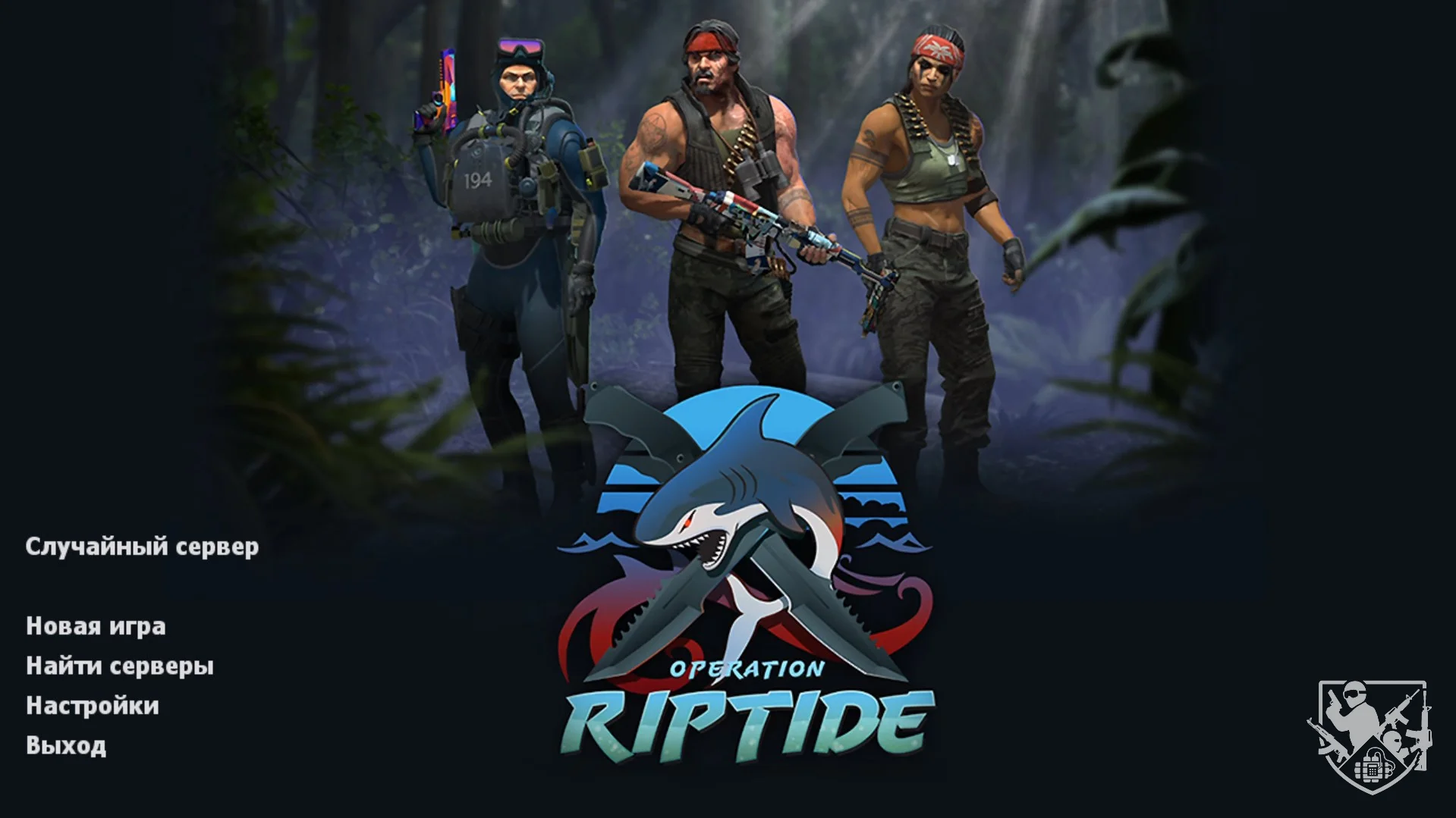 Меню сборки оформлено в темных тонах с освежающими голубыми акцентами, создавая атмосферу летнего спецподразделения. Фоновая картинка — настоящее произведение искусства: на ней харизматичные агенты операции Riptide, такие как капитан Фрэнк «Мокрые носки» Бару с Desert Eagle «Океанская пена», Крэссуотер Забытый с AK-47 «Музей элиты» и Вайпа, вооруженная MAC-10 «Коробка с игрушками». Композицию венчает яркий логотип операции «Хищные воды» с агрессивной акулой и перекрещенными охотничьими ножами.