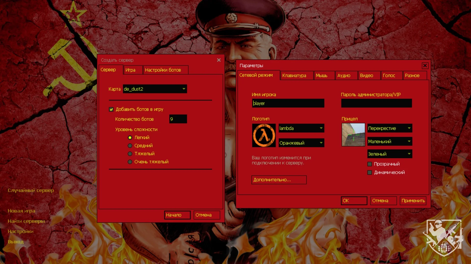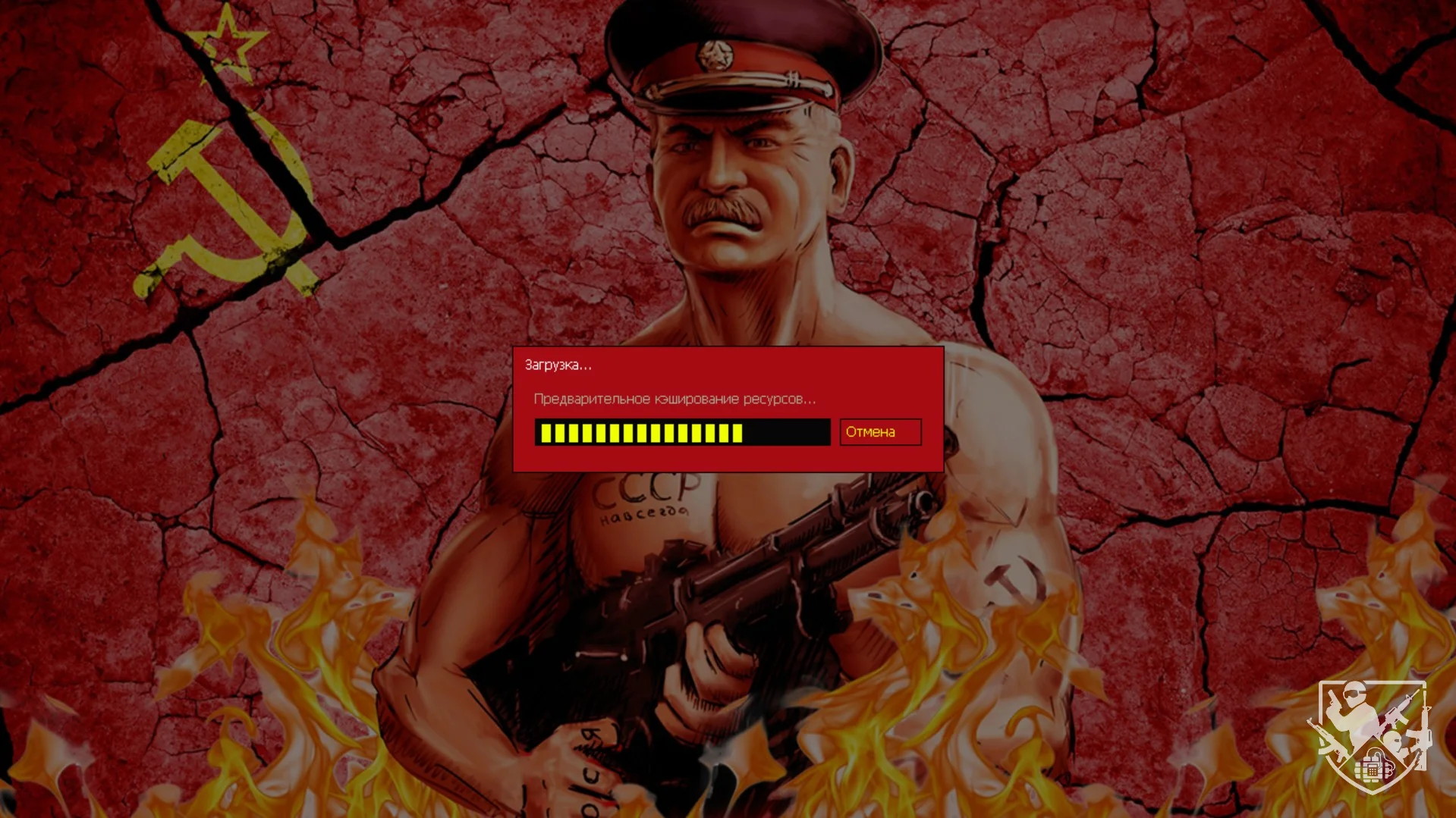 Тематическое Оформление Интерфейса: Игровое меню получило полностью красную цветовую схему, усиливая атмосферу противостояния. Фоном для меню служит эффектное изображение Сталина с пулеметом, которое добавляет сборке эксклюзивности и подчеркивает ее уникальность.