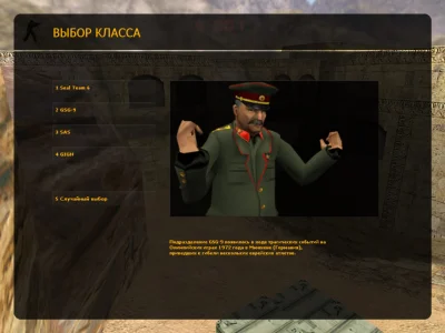 - Исторические лидеры: Уникальное решение — Иосиф Сталин во главе спецназа и Адольф Гитлер в рядах террористов. Эти фигуры придают каждому раунду особый, драматический оттенок, заставляя игроков прочувствовать масштабность происходящего.