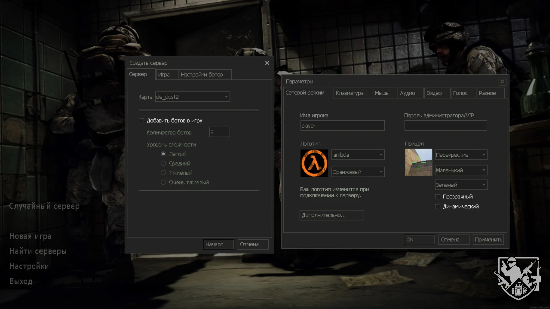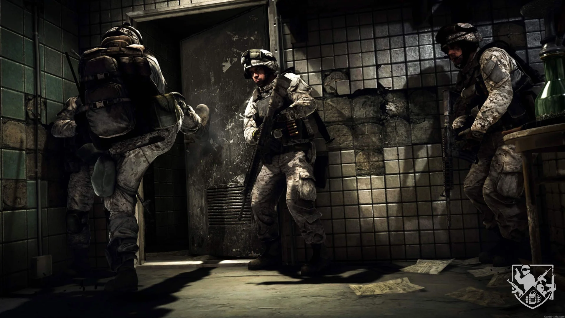 - Динамичный фон меню: В качестве заставки главного меню используется изображение четырех солдат, эффектно врывающихся в дверь, что добавляет атмосфере динамики.