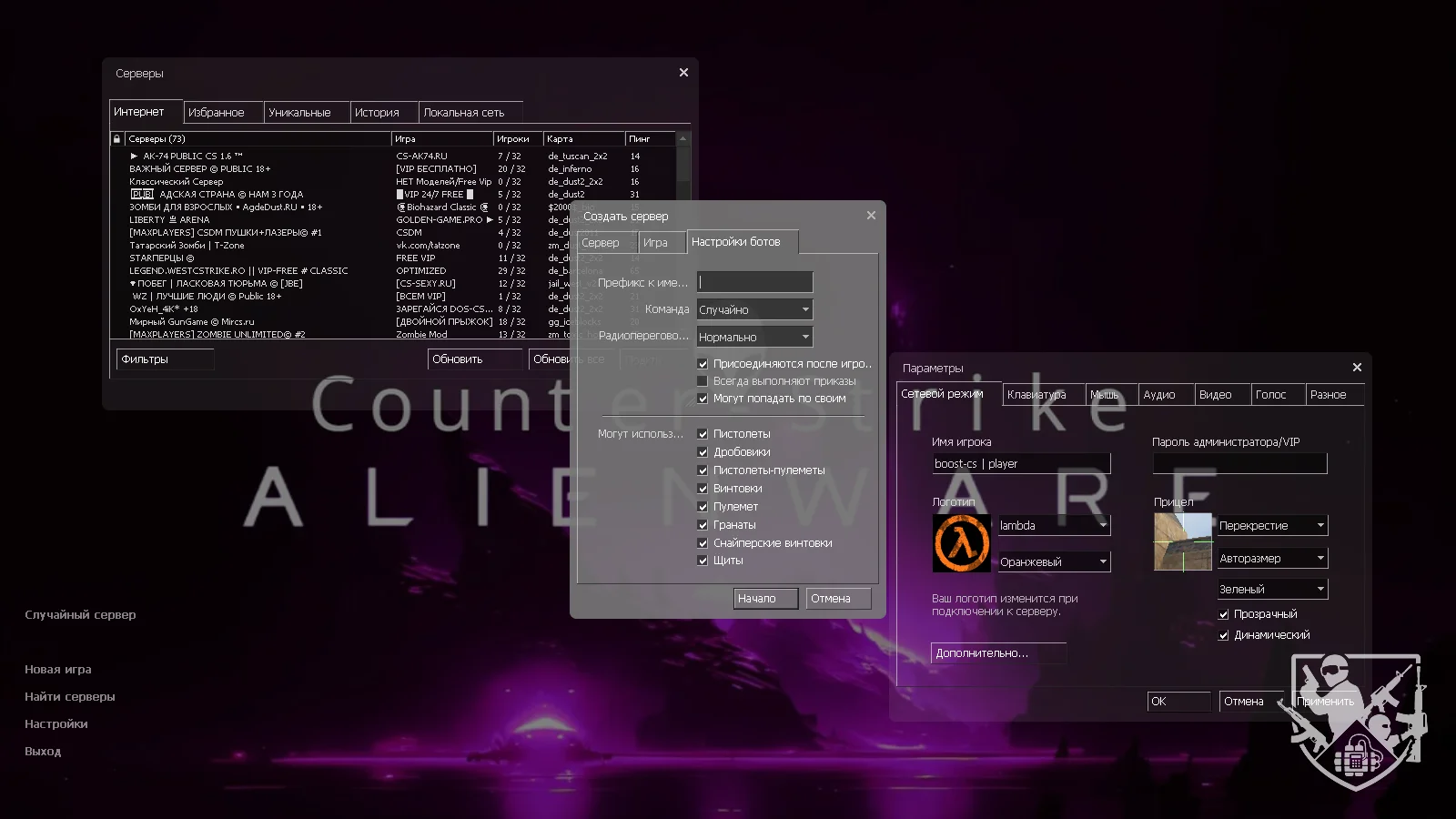 Первое, что бросается в глаза – это оформление. Главное меню окутывает неоновый фиолетовый туман, сквозь который пробиваются очертания фантастического пейзажа. Логотип "Counter-Strike" обрамлен стилизованным изображением инопланетного существа, а под ним гордо красуется надпись "ALIENWARE". Это не просто смена фона, это создание новой вселенной, где привычный мир CS 1.6 приобрел оттенки киберпанка и загадочной чужеродной эстетики. Counter-Strike 1.6 "Alienware" полностью переработана как визуально, так и технически. подойдёт для ценителей современного дизайна и максимальной производительности. сочетание футуристического интерфейса и классического геймплея позволяет полностью погрузиться в атмосферу "хай-тек" сражений. HUD стал более простым и чётким, перестал отвлекать во время игры. арсенал оружий стал более детализированным. модели игроков переработаны. "Alienware" разработана с упором на стабильную игру. конфиг профессионально настроен, что гарантирует минимальный разброс.